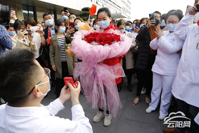 4月6日,是云陽縣支援湖北孝感市醫(yī)療隊(duì)回家的日子,一幕大型現(xiàn)場求婚在云陽縣人民醫(yī)院上演,引發(fā)眾多人圍觀,現(xiàn)場掌聲不斷,歡呼不止。溫馨的求婚現(xiàn)場,男女主人公沉浸在幸福之中,也讓在場見證者都感動(dòng)得掉下眼淚。