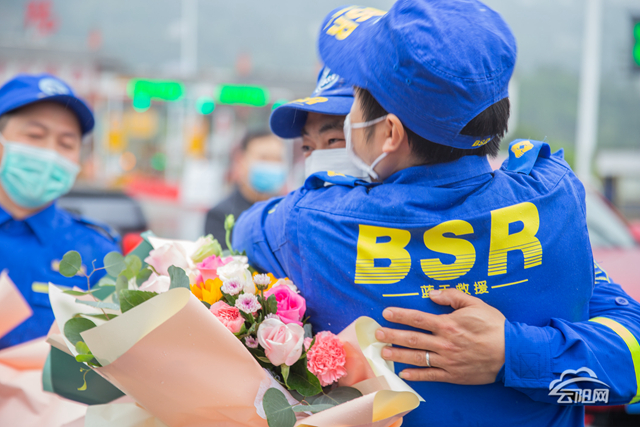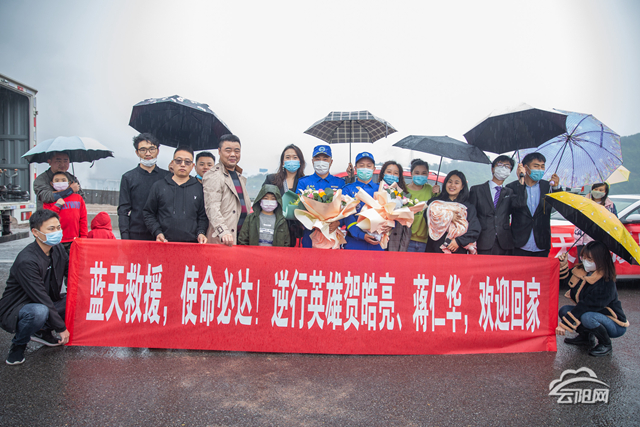 “云陽藍(lán)天救援隊隊員蔣仁華、賀皓亮圓滿完成支援武漢任務(wù),結(jié)束休整,請求歸隊!”在鮮花和掌聲中,賀皓亮、蔣仁華迫不及待地同家人和親朋一起擁抱。