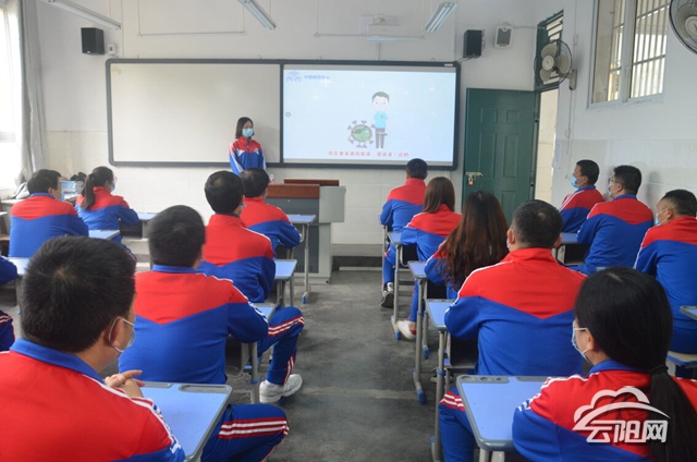 在五(1)班的教室里,班主任正在組織學生觀看“科學防疫”視頻,突然一位學生舉手報告身體不適,并伴有發(fā)燒、咳嗽癥狀,班主任立即上報校防疫辦,帶離該生至校隔離室觀察,并通知家長,防控人員立刻到班級組織其他學生開展防疫隔離相關工作。