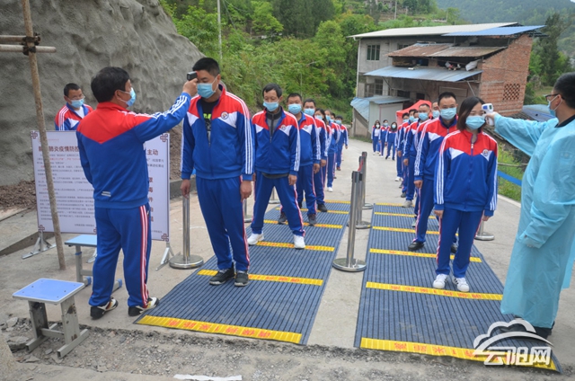 早上7點學生開始入校,校園保安組織學生在校門外沿地標標識間隔一米,分道排隊待檢,防控人員利用紅外線體溫檢測儀對每一位學生進行體溫檢測,體溫正常者允許入校,體溫異常學生經(jīng)復測確認后,登記入冊,通知家長,及時送校外臨時留觀區(qū)待診。