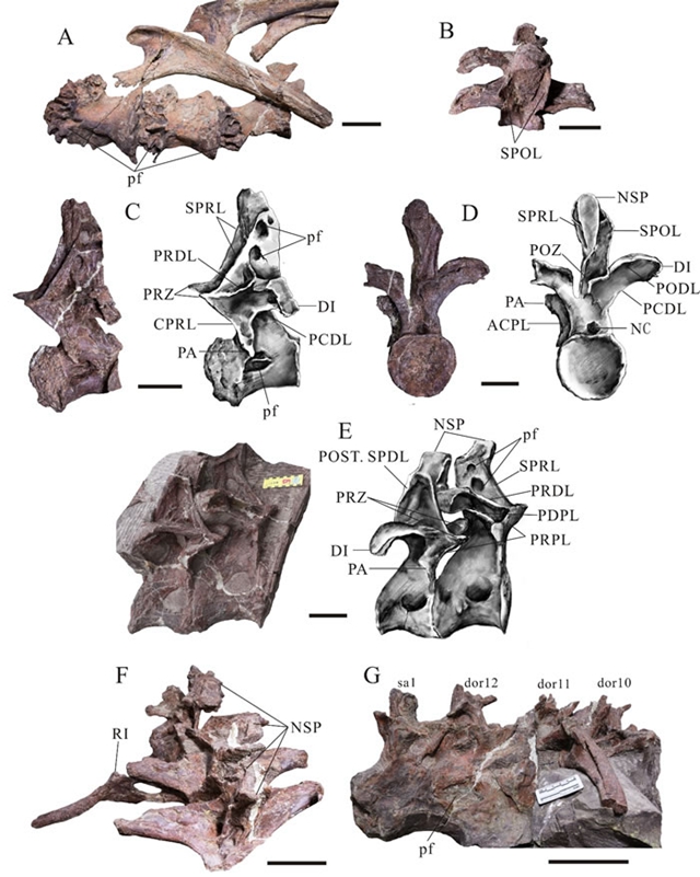 研究表明,普賢峨眉龍具有自己獨有的特征:所有薦前椎后凹,中部頸椎具復(fù)雜的氣腔構(gòu)造,背椎側(cè)凹被次級隔板分隔,前部尾椎神經(jīng)棘末端向后擴展,肱骨三角肌嵴指向后外側(cè),尺骨與肱骨比為0.69。