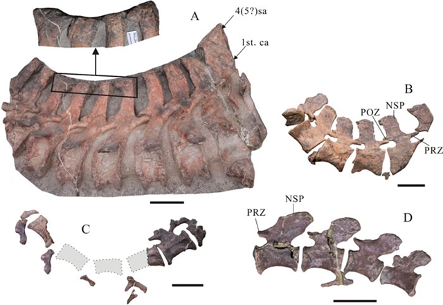 普賢峨眉龍的前部、中部和后部尾椎,比例尺10cm