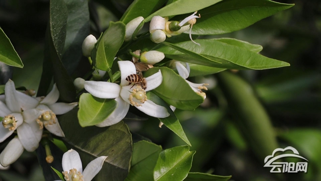 曬經村晚熟柑橘示范園前臨一江碧水,背倚延綿青山。從空中俯瞰,上萬株果樹郁郁蔥蔥,頗為壯觀。走進果園,橙花獨特的香氣撲面而來,為大地灑下“空氣清新劑”。陽光照耀下,小巧玲瓏的朵朵橙花似星晨點點,一叢叢,一簇簇,潔白無暇,溫潤如玉。
