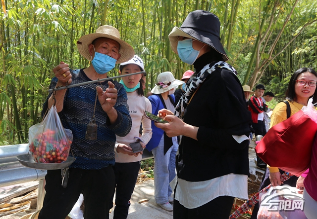 云陽網(wǎng)訊(記者 何競嘉 付驁 熊力毅)4月15日,“櫻·游春日”盤龍街道鄉(xiāng)村休閑健康體驗季暨櫻桃采摘節(jié)開幕,游客紛至沓來,購買四民村的櫻桃。
