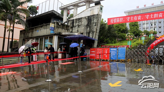 學生們陸續(xù)來到校門口,在老師的指引下,保持間隔依次排隊入校,按照地面入校通道標識,經(jīng)過紅外線測溫檢測后,刷臉進入校園,現(xiàn)場秩序有條不紊。現(xiàn)場老師也在不停地提醒著保持間距,同時按照信息表核驗每位進校學生的渝康碼,并對學生所有的行李進行消毒。