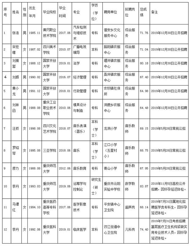 醫(yī)學類專業(yè)畢業(yè)生考核招聘公告》、《2019年重慶市基層醫(yī)療衛(wèi)生機構緊缺實用專業(yè)技術人員考核招聘公告》確定的程序,現(xiàn)將三次公招擬聘人員予以公示。