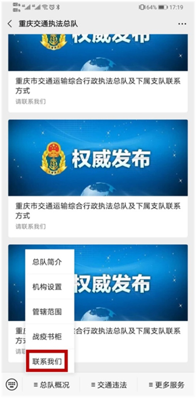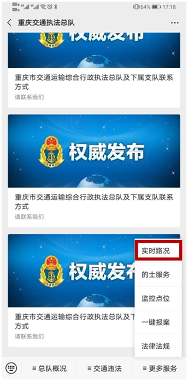 如何具體操作?在“交通違法”板塊,車主、運輸企業可以通過輸入車牌號碼、發動機編號的形式查詢所屬車輛在高速公路的相關違法信息,并能通過“綁定車輛”處理不超過200元的交通違法案件。市民朋友可以在“更多服務”板塊的“實時路況”欄目內,查詢、了解全市高速公路的實時路況信息、交通管制信息以及重要的施工信息,以便更加合理的選擇出行線路、規劃出行行程。在“總隊概況”板塊,市民朋友可以點擊“聯系我們”及時查詢市交通行政執法總隊及下屬各支隊報案電話,市交通行政執法總隊及下屬各支隊也將按照職責及時處置各類報案信息,及時提供相應的執法服務。此外,市交通執法總隊還將通過官方微信公眾號不定時發布交通綜合執法工作的相關信息以及重要的執法整治行動信息,適時曝光重點違法行為,通報典型事故案例,宣傳高速公路安全行車常識。