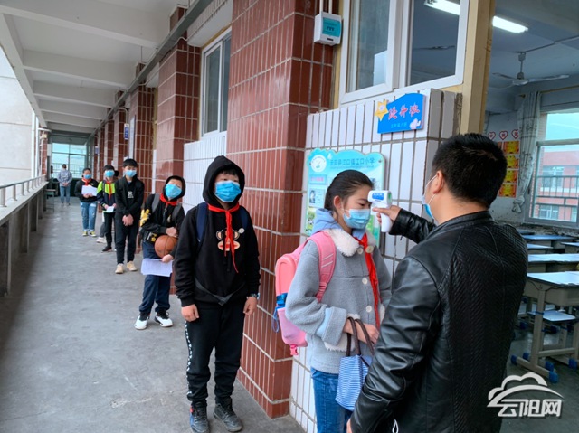 云陽網訊(通訊員 郭艷 肖先輝)4月27日,江口小學四、五、六年級1700余學生在晨風的指引中,朝陽的陪伴下返校復課。在疫情防控時期,今年的入學也以特別的形式迎接學生:測體溫、消毒、固定的行走路線……