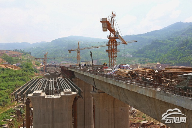 據了解,澎溪河多線特大橋全長741.6米,共14跨,其中主跨長度為200米,主墩在長江一級支流澎溪河中,大橋的一頭連接人和隧道,另一頭連接云陽車站多線特大橋,是萬州方向到云陽站的最后一公里路程。