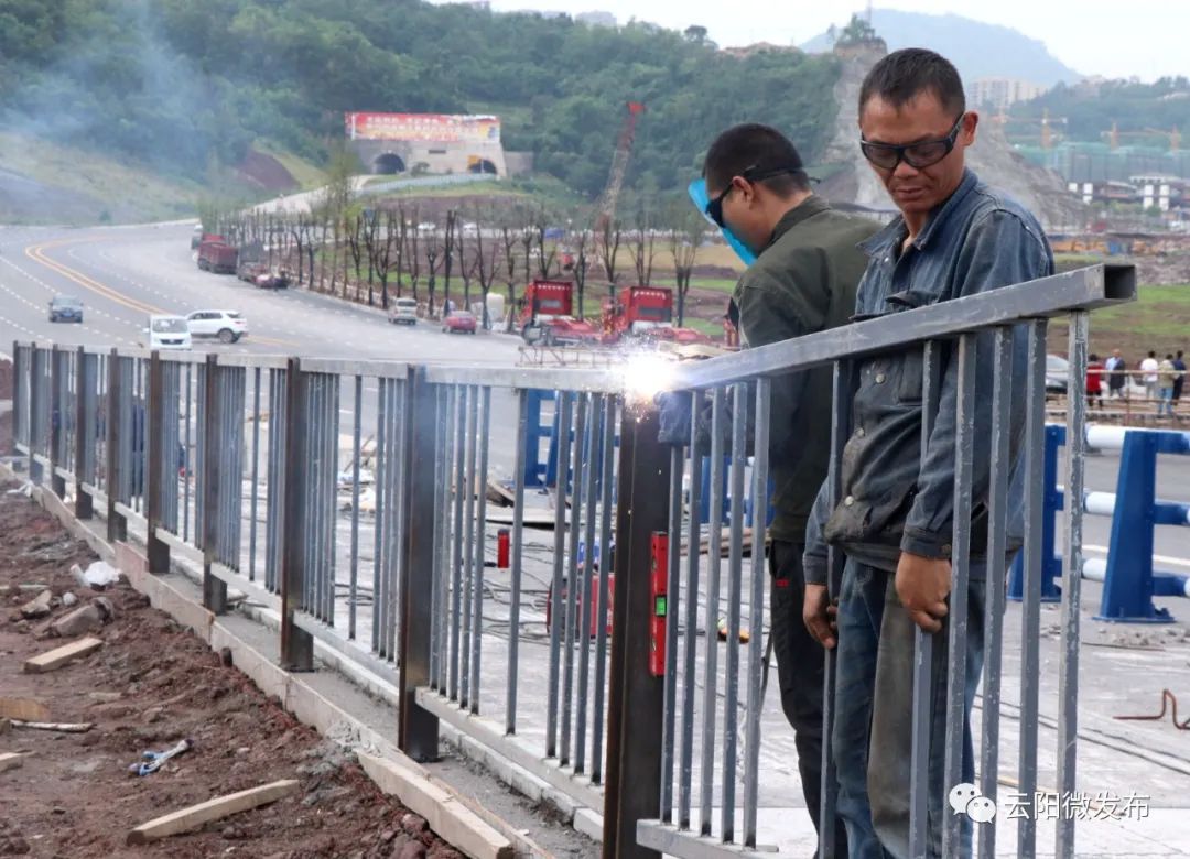 施工現場,工人們正忙著焊接護欄、道路劃線、安裝路燈,幾輛機械車來回作業,為全線貫通通車作最后的準備。