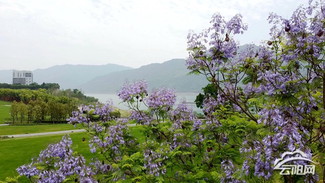 云陽網訊(陳小婭)伴著五月熱烈的陽光,月光草坪藍花楹盛開了,夢幻浪漫的花朵為公園錦上添花,美不勝收。來到月光草坪的藍花楹大道,只見一株株高大挺拔的藍花楹樹冠上盛開著茂密的花朵。藍紫相間的朵朵小花,擠擠挨挨,細細密密,盛開在枝頭,蕩漾在風中,猶如一串串風鈴。在夢幻浪漫的花海見證下,月光劇場上一對幸福的新人正喜氣洋洋地舉辦婚禮。