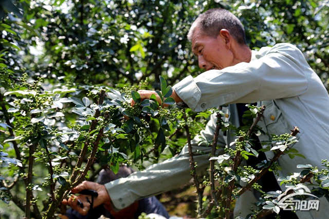 “我們種植的花椒叫做九葉青花椒,屬于早熟品種。花椒采摘分兩批進行,鮮椒采摘于5月25日就開始了,而用于加工制作的干花椒,我們要等到6月10日之后才開始采摘。目前,基地里每天大約有50人采摘鮮椒,每人每天能掙200元。”外郎鄉五龍村花椒基地技術員黃永良說。