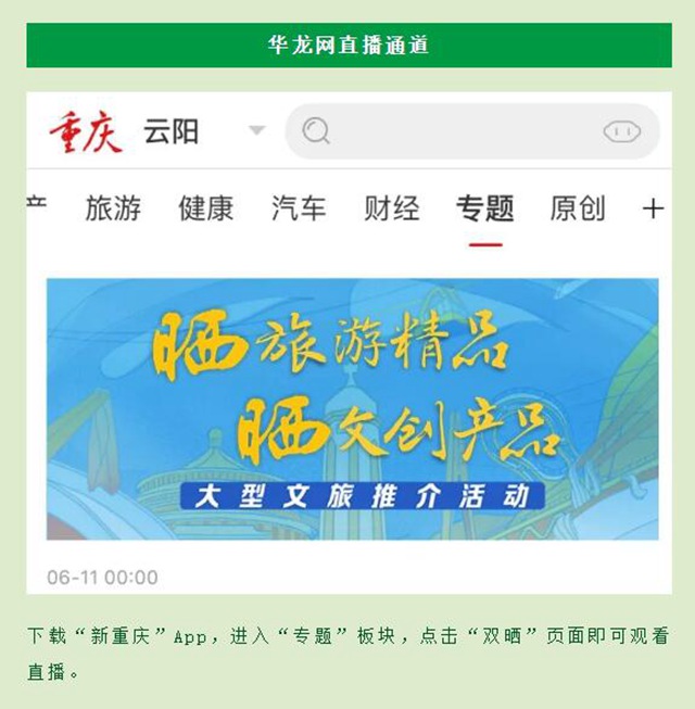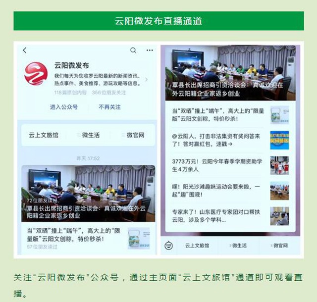 關(guān)注“云陽微發(fā)布”公眾號,通過主頁面“云上文旅館”通道即可觀看直播。