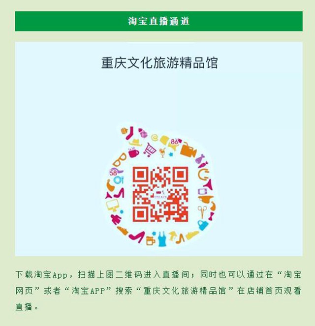 下載淘寶App,掃描上圖二維碼進入直播間;同時也可以通過在“淘寶網(wǎng)頁”或者“淘寶APP”搜索“重慶文化旅游精品館”在店鋪首頁觀看直播。