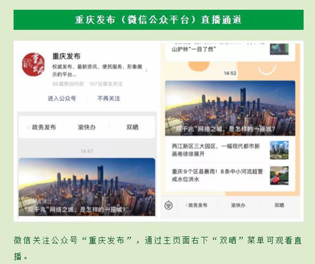 微信關(guān)注公眾號“重慶發(fā)布”,通過主頁面右下“雙曬”菜單可觀看直播。