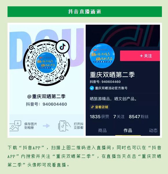 下載“抖音APP”,掃描上圖二維碼進入直播間;同時也可以在“抖音APP”內(nèi)搜索并關(guān)注“重慶雙曬第二季”,在直播當天點擊“重慶雙曬第二季”頭像即可觀看直播。
