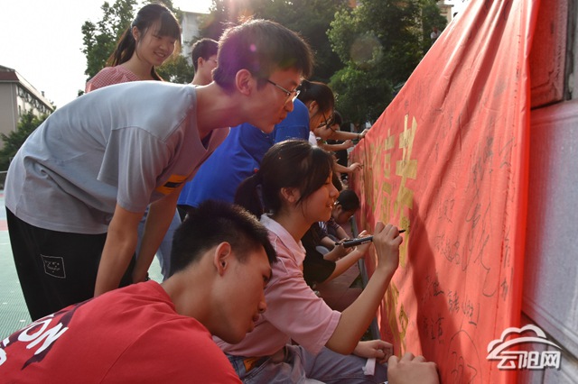 各班考生還到高考勵志宣言巨幅標語榜上簽名留念,有的還寫下了班級和個人的個性宣言,為青春和夢想奮斗。