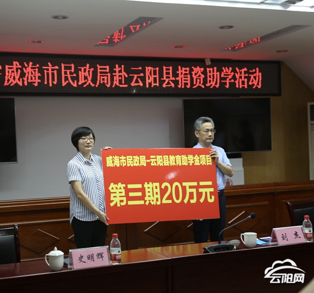 云陽(yáng)網(wǎng)訊(記者 陳小婭)心系貧困學(xué)子,情暖巴渝大地。 7月3日,山東省威海市民政局來(lái)我縣開(kāi)展東西部扶貧協(xié)作捐資助學(xué)活動(dòng)。儀式上,威海市民政局黨委委員、副局長(zhǎng)劉杰向我縣授捐贈(zèng)牌。本次捐贈(zèng)為威海市民政局對(duì)口幫扶我縣的第三期教育助學(xué)金項(xiàng)目,金額20萬(wàn)元,將用于資助云陽(yáng)中學(xué)和南溪中學(xué)的100名貧困高中生。