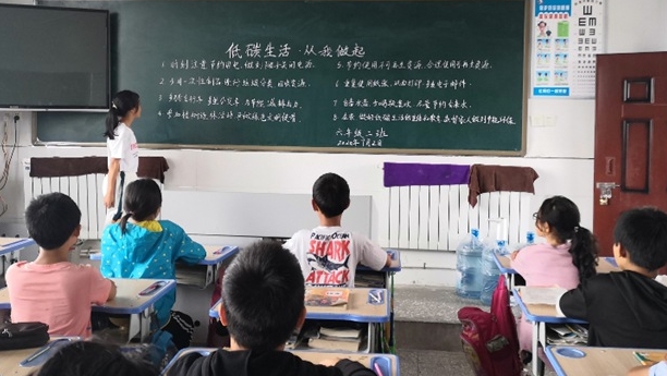 在課堂上,老師告訴孩子們7月2日為“全國低碳日”,并把此次活動分為幾個環節開展,首先讓大家觀看了關于“低碳生活”短片,然后讓孩子們對自己所知道的低碳環保知識大膽發言分享,并說說自己平時在生活做了哪些不低碳的事。最后,通過學習和了解,孩子們知道了人們在生活和消費過程中的過量碳排放,是造成全球氣候變暖的重要因素之一,氣候變化與我們每個人都息息相關。六年級的幾名學生說:“通過今天的學習,我們會從自己身邊的細節做起,成為“低碳達人”,保護我們這個賴以生存的地球家園,讓人類可以盡情享受大自然賦予我們的幸福!”