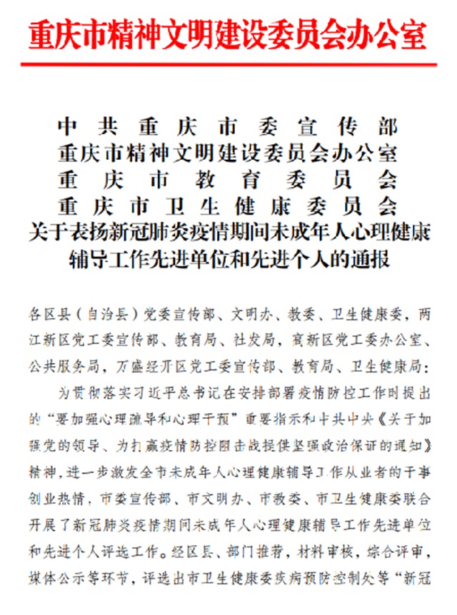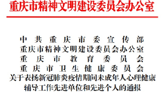 7月7日,市委宣傳部、市精神文明辦、市教委、市衛(wèi)健委聯(lián)合發(fā)文,表彰新冠肺炎疫情期間未成年人心理健康輔導(dǎo)工作先進(jìn)單位和先進(jìn)個人。其中,來自云陽的重慶市中山外國語學(xué)校獲評先進(jìn)單位,該校健康教師顏曉榮獲評先進(jìn)個人。