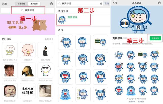 微信表情商店搜索“真真辟謠”,進入表情專輯,點擊“使用表情”,即可使用。