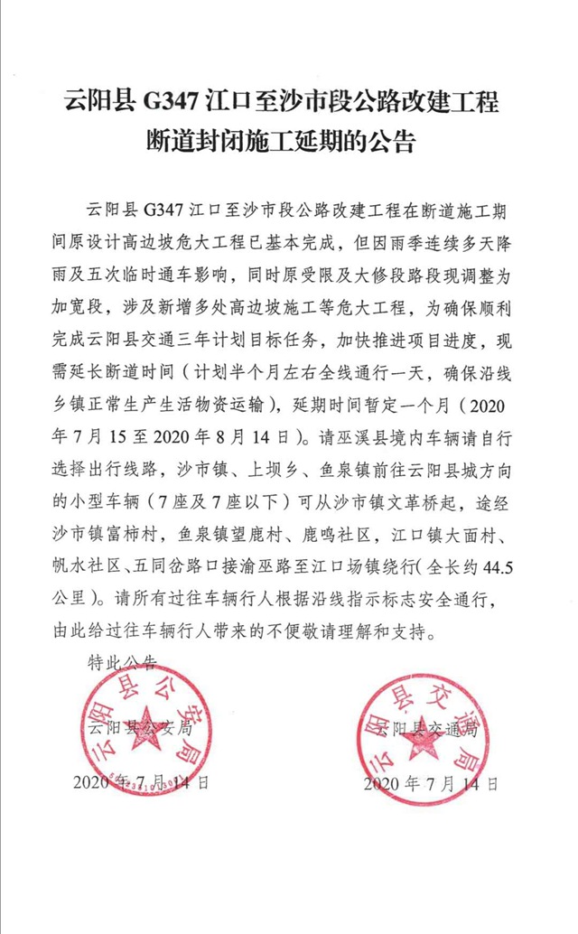 云陽網(wǎng)訊(記者 陳愛玲 徐銳)7月14日,記者從相關(guān)部門獲悉,云陽縣G347江口至沙市段公路改建工程在斷道施工期間原設(shè)計高邊坡危大工程已基本完成,但因雨季連續(xù)多天降雨及五次臨時通車影響,同時原受限及大修段路段現(xiàn)調(diào)整為加寬段,涉及新增多處高邊坡施工等危大工程。為確保順利完成我縣交通三年計劃目標(biāo)任務(wù),加快推進(jìn)項目進(jìn)度,現(xiàn)需延長斷道時間,暫定一個月,延期時間為7月15日至8月14日(計劃半個月左右全線通行一天,確保沿線鄉(xiāng)鎮(zhèn)正常生產(chǎn)生活物資運(yùn)輸)。
