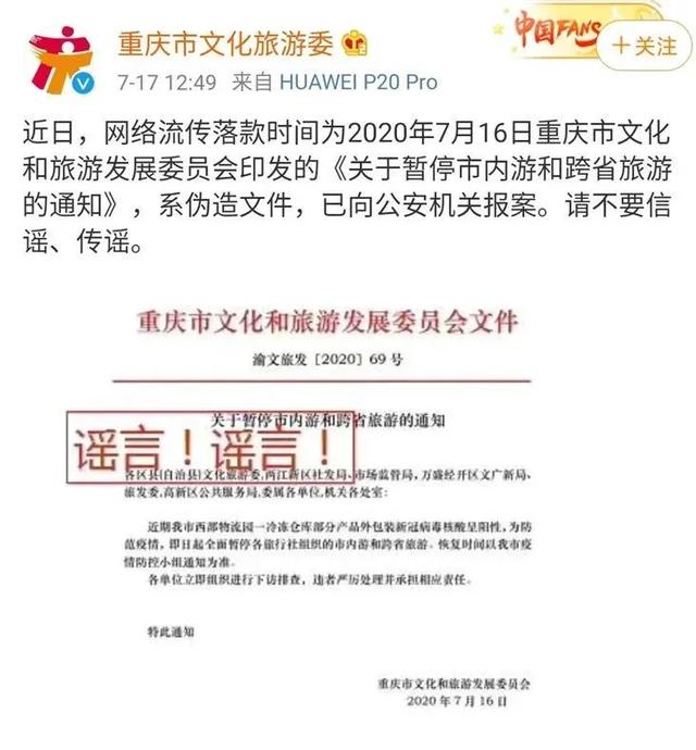這個消息嚇到了很多有暑期出行計劃的重慶人。不過,請各位放心,這是假消息!@重慶市文化旅游委 17日發(fā)布消息,確認此文件系偽造文件,已向公安機關(guān)報案。請不要信謠、傳謠。