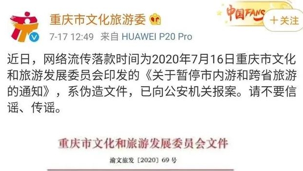 謠言:重慶暫停市內(nèi)游和跨省旅游