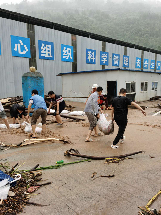 由于拌和站橋梁涵洞處有上游泥沙、樹渣堆積,排水不足,水位上升地面淹至人體膝蓋處,工區救援人員被急流分散。梁鵬、牛慶、譚楊輝、孔凡與副總工丁辰昱、試驗室主任黃才建組織各管理人員與勞務隊人員,手牽著手,互相攙扶支撐,按應急方案分別用沙袋堆碼堤壩。同時出動挖機來疏通河道、出動鏟車推除圍欄引流。暴雨還在繼續,沙袋碼好后又被沖走,梁鵬緊急決定用裝載機運送沙袋和救援人員,大家團結一心,在暴雨、急流和滾石的轟鳴中排險疏通。至19時,雖工區進入停水停電,但已完成全體人員疏散,水位開始下降。