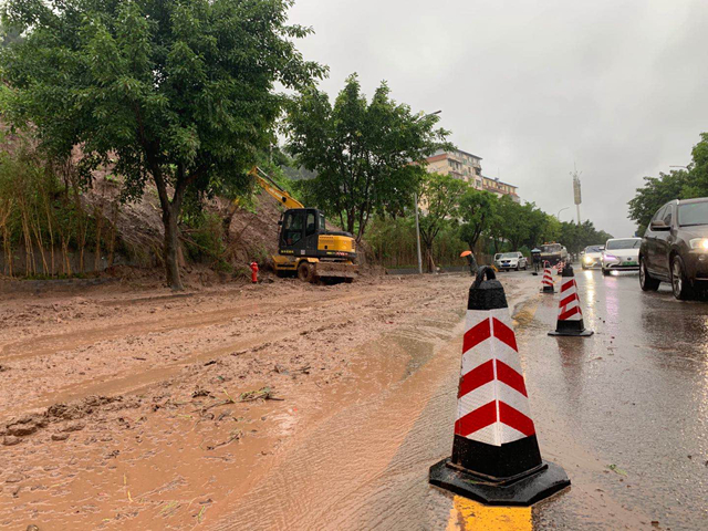 在稻香路,挖掘機和工人們正冒雨排危搶險。此處受災點是于18日凌晨2:00發生大面積邊坡垮塌,幾百方泥石將道路完全阻斷。記者在現場看到,經過連夜搶險作業,現場道路已恢復單邊通行。“我們連夜組織人員調集一臺挖掘機、四臺車輛連夜進行搶險,下一步我們要繼續清理,再用環衛車進行清洗。”縣市政設施管理所副所長曾勇介紹現場情況。