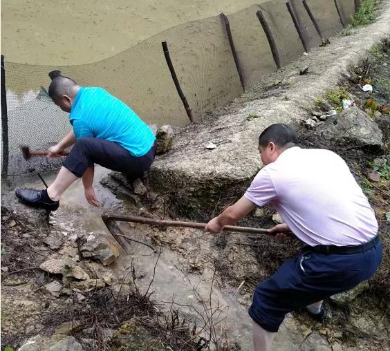 鎮村干部對雙峰村居民家中的魚塘進行搶修