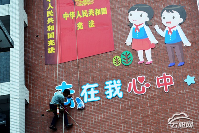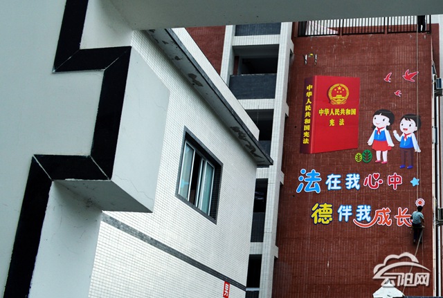 云陽網訊(通訊員 胡靜波)7月24日,云陽縣彭詠梧小學施工人員正在涂裝一面以《憲法》為主體風格的校園文化墻。由此,全縣第一個“青少年法治教育基地”啟動建設。