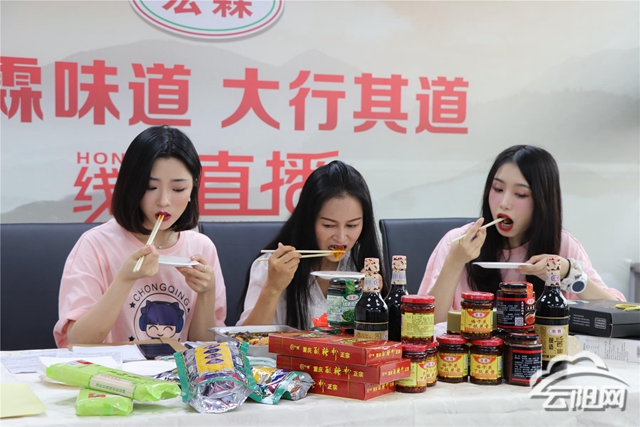 在盤龍創業園重慶宏霖食品有限公司直播間里,團員青年代表和該公司總經理譚曉紅組成吃播團隊,現場試吃公司新推出的香辣烤魚、豆豉烤魚、麻辣小龍蝦等產品。主播們還現場煮了一碗云陽面,加入宏霖食品有限公司的手工釀造醬油、花椒醬、蘿卜干醬等調料,對著鏡頭大快朵頤。“這就是重慶味道,麻辣鮮香,快買快買。”