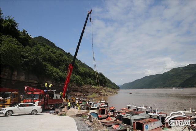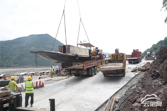 云陽網訊(記者 趙曉龍)7月27日上午10時20分,故陵鎮大地坪碼頭,牌照號為“渝云漁80017”的鐵質漁船破水而出,被吊裝到大貨車上運至清水湖。伴隨著67艘漁船紛紛被吊裝運走,標志著全縣首批134名漁民率先告別水上生活。