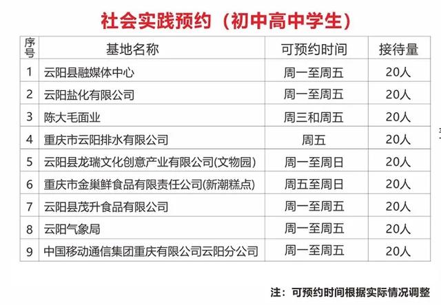 目前,云陽縣融媒體中心(原電視臺等單位合并)、中國移動云陽分公司、文物園、云陽排水公司、云陽鹽化有限公司、金巢鮮食品有限公司(新潮糕點)、茂升食品有限公司(王茂生桃片糕)、陳大毛面業、云陽氣象局等9家單位開放給初、高中學生做考察探究、職業體驗活動,同時可以獲得綜合評價證明材料!