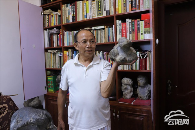 走進老人的屋子,不足10平方米的客廳里,除書架上面列滿了醫書古籍外,在書籍下方及屋子其他角落都擺放著他引以為豪的大大小小、不計其數的奇石。張飛頭像石、哪吒鬧海石、烏龜石、鷹頭石……這里的每一塊石頭都是老人從長江邊、河壩邊搬回來。
