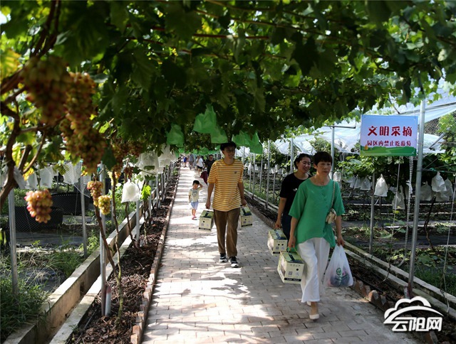據介紹,云陽·威海多集合現代農業產業園位于鳳鳴鎮馬軒村,由云陽縣、威海市共同建設而成,是東西部扶貧協作的重要成果之一。產業園總投資5000萬元,現已完成投資3000萬元,占地2000余畝,建成標準插地棚136個、面積33000平方、溫室大棚5000平米。該產業園主要生產各類綠色蔬菜、水果和生態魚,在特色農產品生產、優良品種選育、生產標準試驗示范、現代農業科技培訓推廣等方面效果明顯,已逐步發展成規模大、種類全、質量好的現代農業產業園。今天開園的葡萄園約60畝,種植有陽光玫瑰、浪漫紅顏、夏黑、美人指等9個品種。