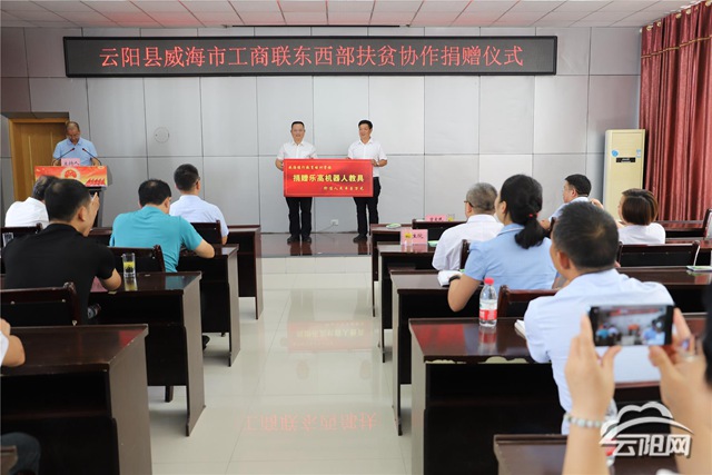 在威海市工商聯東西部扶貧協作捐贈儀式上,威海市工商聯分別向泥溪社區和石缸村捐贈現金2萬元、為泥溪小學捐贈價值1萬元的樂高機器人教具、泥溪鎮衛生院捐贈價值1.35萬元的醫用病床3張。