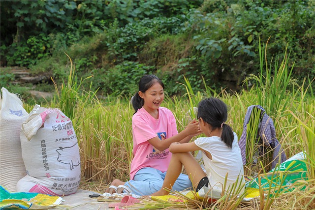 秋收時節,一串串顆粒飽滿的稻穗在太陽照射下閃閃發光,散發出陣陣稻香。孩子們在田間嬉戲,臉上洋溢著幸福的笑容。(譚啟云 攝)