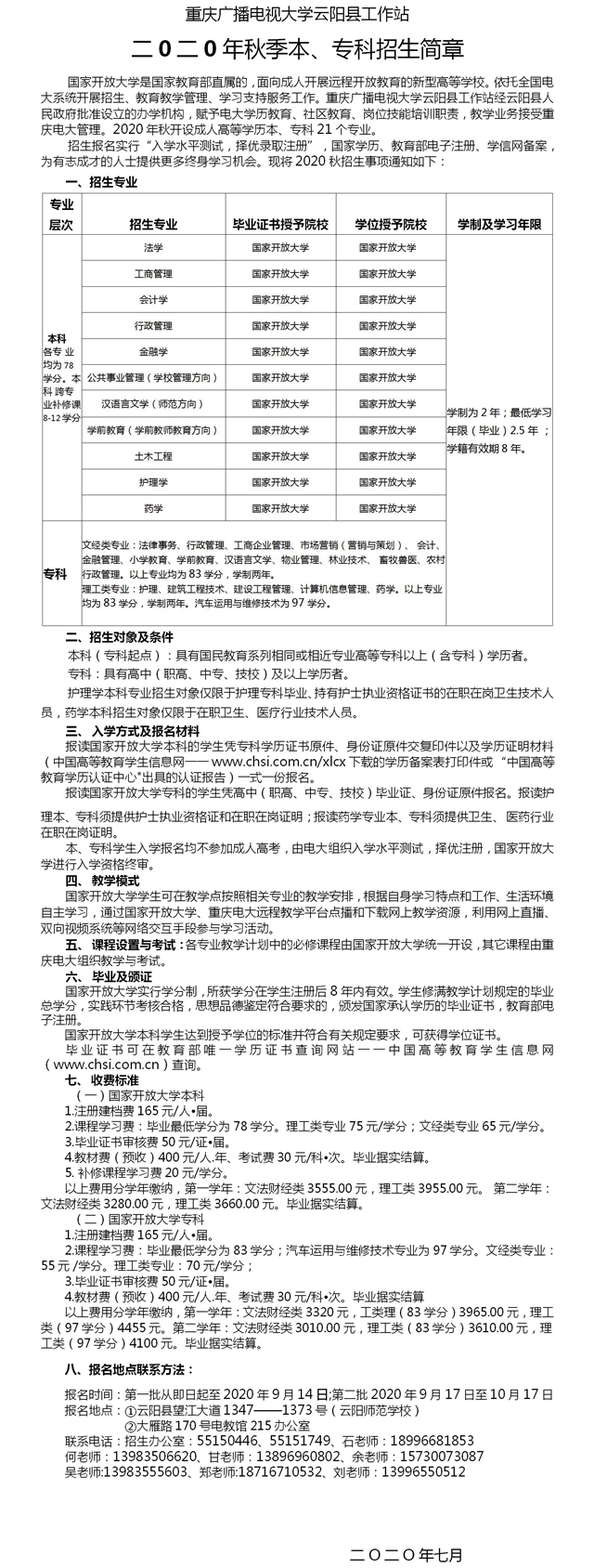 重慶廣播電視大學云陽縣工作站2020年秋季招生簡章