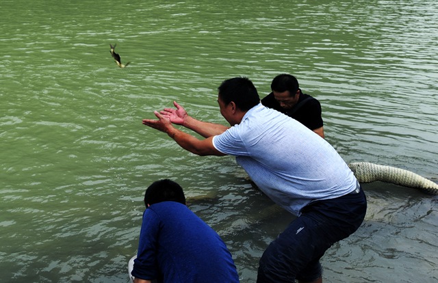 據悉,今年5月中旬,家住云陽縣沙市鎮的王吉發、王吉波兩兄弟私自下河采用電捕漁具非法捕撈,經群眾舉報后被沙沱派出所查獲,收繳電捕漁具1臺、野生魚2公斤多,二人因此涉嫌構成非法捕撈水產品罪被偵查,后由萬州區人民檢察院批準逮捕,提交萬州區法院環資庭審理。根據這一突發情況,結合當地群眾平常生活習慣,查辦案件的執法單位按照“河長制”基本精神現場辦公,決定深入鄉鎮社區開展一次聯合普法和公益放生。兩名非法捕魚的涉事人自愿出資購買魚苗3萬余尾,通過增殖放流、回補生態來將功贖罪,爭取寬大處理。