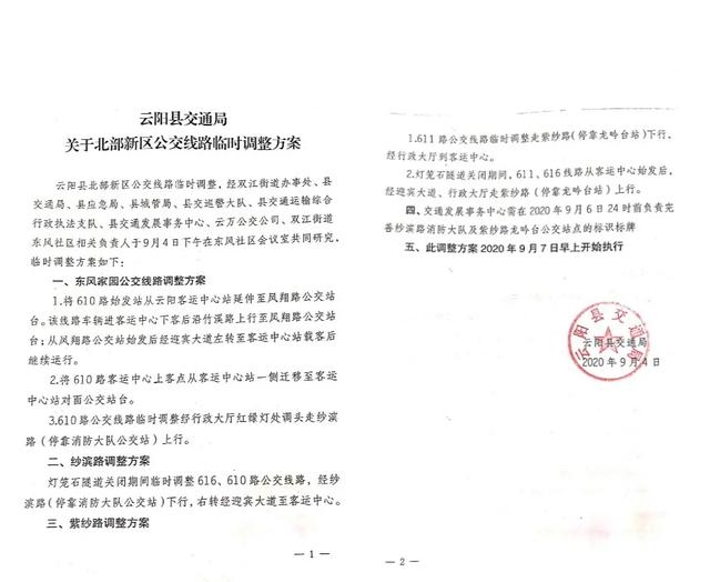 1、將610路始發(fā)站從云陽客運中心站延伸至鳳翔路公交站臺。該線路車輛進客運中心下客后沿竹溪路上行至鳳翔路公交站臺;從鳳翔路公交站始發(fā)后經迎賓大道左轉至客運中心站載客后繼續(xù)運行。