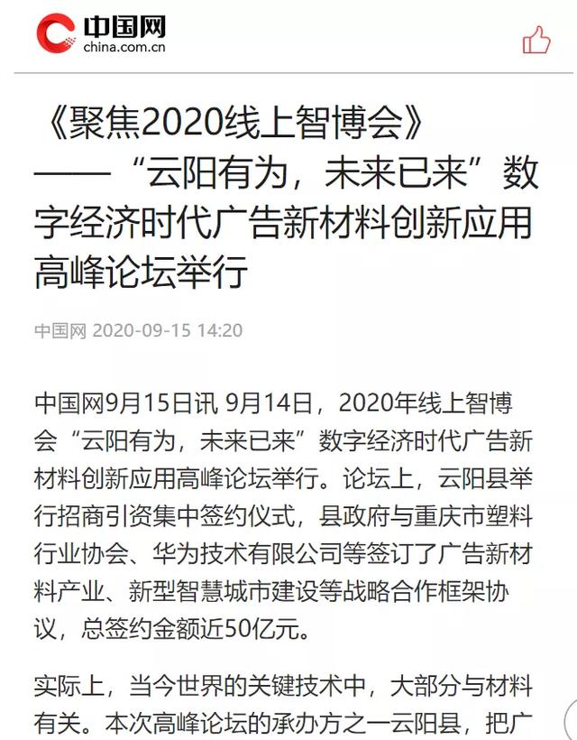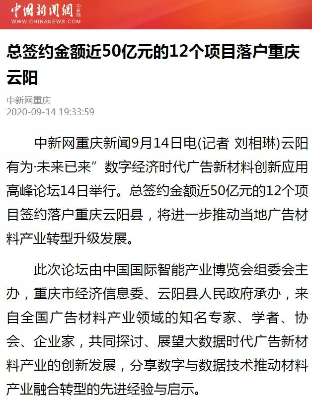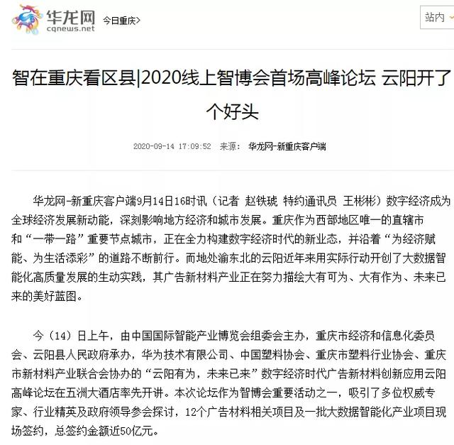 9月14日,2020線上中國國際智能產業博覽會——“云陽有為,未來已來”數字經濟時代廣告新材料創新應用云陽高峰論壇在重慶舉行。