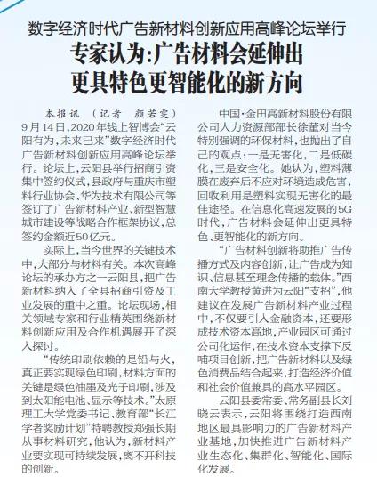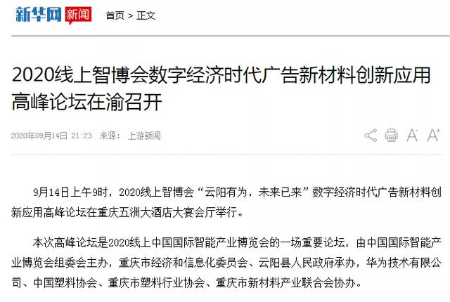 《聚焦2020線上智博會》——“云陽有為,未來已來”數字經濟時代廣告新材料創新應用高峰論壇舉行