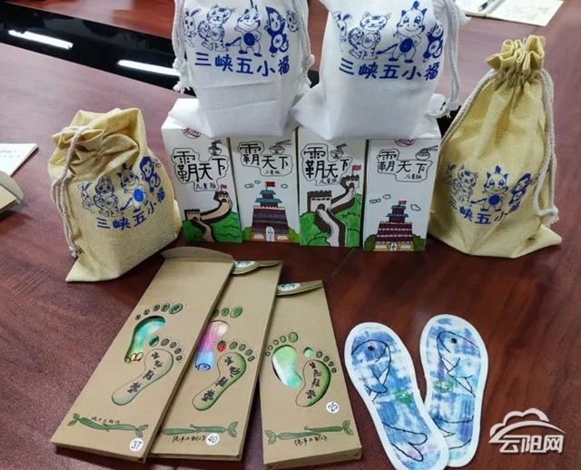 據介紹,文創旅游產品“三峽五小福伴手禮”是該校電子商務專業學生曾怡嘉、賀倩云、舒琴設計制作的。通過梳理本地民間文化、歷史文化,借助在平面設計課上學到的知識,創作出“三峽五小福”形象,并做成書簽、便利貼、布袋、商品包裝盒。同時,整合三峽地區的農特產品桃片糕、菊花、紅薯干,設計制作出了一個具有濃郁三峽文化特色的文創旅游產品——伴手禮。