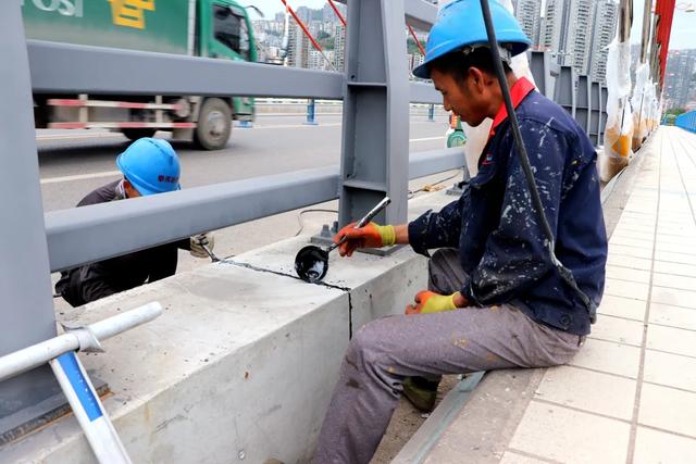 工人們正埋頭專心為長江大橋“強健筋骨”。