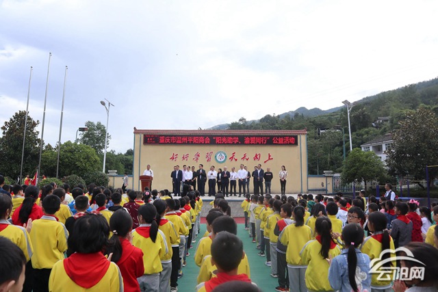 重慶溫州平陽商會會長黃克鎖在捐贈儀式上諄諄教導(dǎo)全體學(xué)生好好讀書,少年強(qiáng)則國強(qiáng),努力奮斗,爭做有益于國家,有益于社會的新青年。