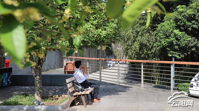 在兩江廣場,有市民坐在桂花樹下乘涼。其間,愛好樂器的老周,在桂花樹下吹起了笛子。笛聲飄揚,恍若長空里萬點的花瓣紛紛飄落。在月光草坪散步的市民戴流權告訴記者,今天趁著陽光明媚的好天氣,出來散散步。走在月光草坪的林蔭小道,聞著桂花飄香,他覺得云陽這座城市的環境特別優美,生活在這里,感覺很舒心。