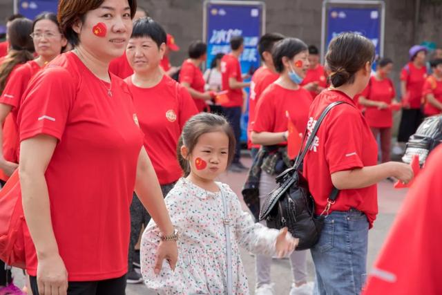 身穿統一的服裝,手持五星紅旗