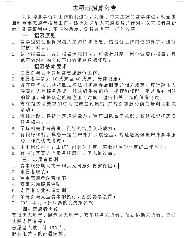 云陽網訊(記者 何競嘉)近日,記者從縣文旅委獲悉,隨著2020“萬里長江·天生云陽”戶外多項運動挑戰賽開賽日期的日益臨近,各項準備工作也在緊鑼密鼓的展開。賽事組委會現向社會招募150名賽事志愿者。